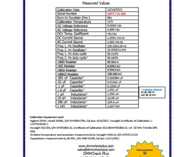 Above, is an example of the Measured-Values sheet that is included with every DMMCheck Plus. In this example, the customer specified the dual-frequency option with oscillator values of 100Hz and 10KHz.